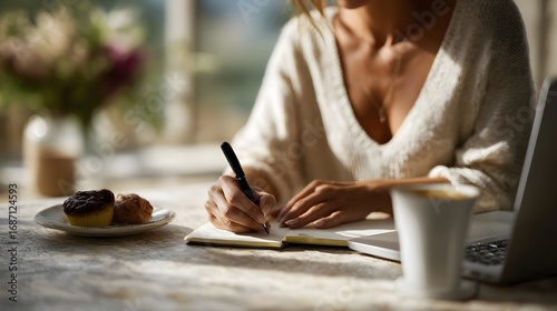 Woman diligently writing financial goals in notebook next to laptop and coffee on a sunlit table planning her future