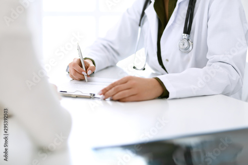 Woman doctor and patient sitting and talking at medical examination at hospital office, close-up. Therapist filling up medication history records. Medicine and healthcare concept