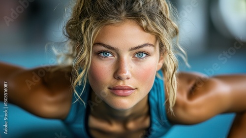 Woman does pushup exercise in gym, looking forward, soft focus interior view