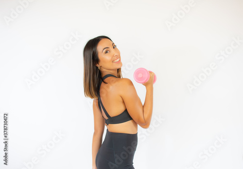 Woman doing exercise with a pink dumbbell while turning to look at the camera