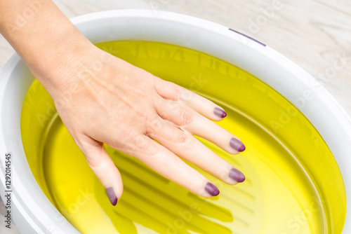 woman doing paraffin therapy for hands, close-up. woman's hand covered in paraffin. spa manicure procedure. hand and foot spa. wax bath. body wax. paraffin hand mask