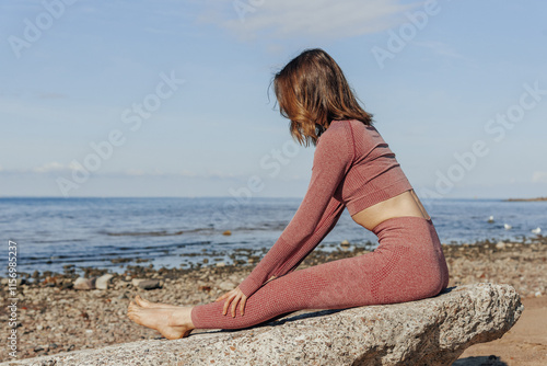 Woman doing yoga on sandy beach, female sport background sea blue sky, sunny day