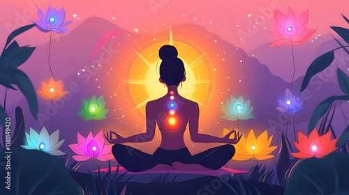Woman Doing Yoga With Lotus Flowers And Chakra