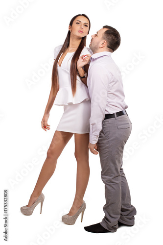 Woman dominates male. Female boss berates his subordinates. Interaction in the business team. Woman director and a man slave. Relationship between man and woman. Isolated white background.