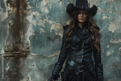 Woman dressed as Vampire Hunter Van Helsing in homemade Halloween costume with black cape and cowboy hat