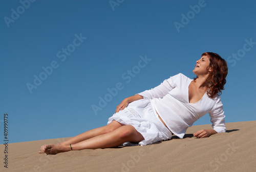 woman dressed in white enjoying in the sand dunes on the sunny day