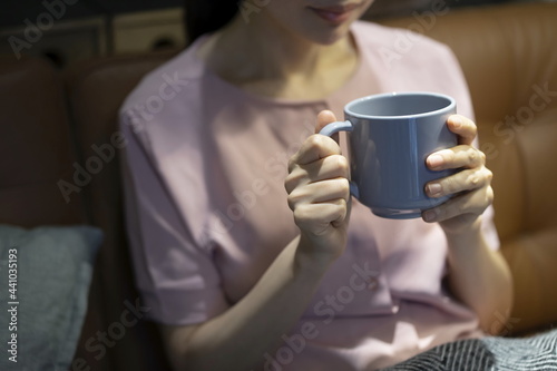 Woman drinking coffee in living room
