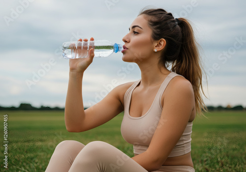 Woman drinking water after exercise, Fit girl hydrating outdoors, Generative AI image