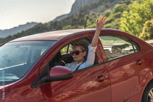 Woman driving a car. A lady in sunglasses takes the wheel of her