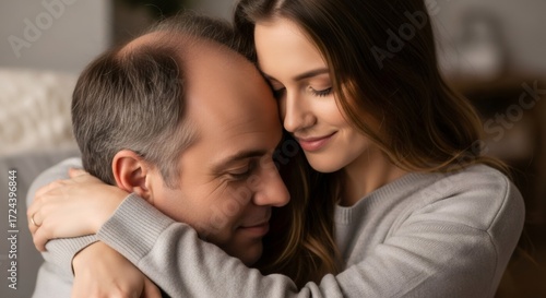 Woman embracing man with receding hairline and experiencing hair loss. Concept about balding, hair treatment and hair care.