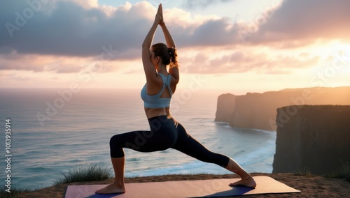 woman engaged in a yoga pose outdoors, demonstrating balance and focus against a backdrop of ocean and cliff during golden hour