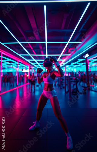Woman Engaged in Virtual Reality Boxing at Neon-Lit Arena