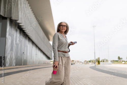 Woman enjoying a stroll in a modern urban setting while holding a smartphone and a drink