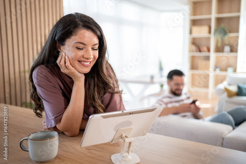 Woman enjoying digital tablet at home with man relaxing on sofa
