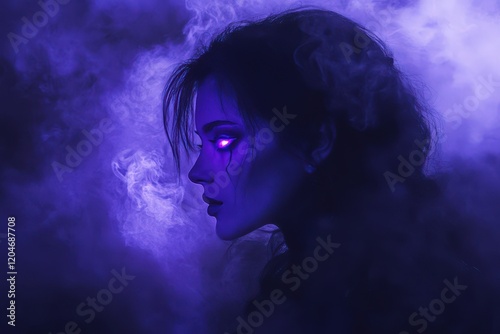 Woman Enveloped In Purple Smoke Mysterious Glowing Eyes