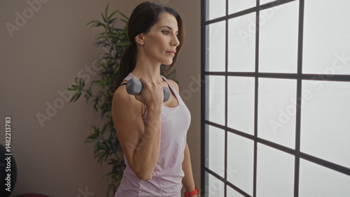Woman exercising indoors holding dumbbell in gymnasium with brunette hair and wearing athletic tank top focused and determined against bright background of large window.