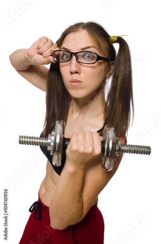 Woman exercising with dumbbells isolated on white