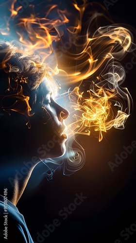 Woman Exhaling Smoke and Light.
