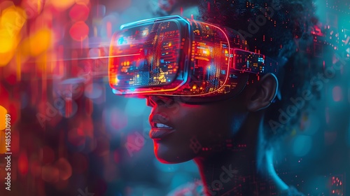 Woman Experiencing Immersive Virtual Reality Headset Technology Futuristic Neon Lights