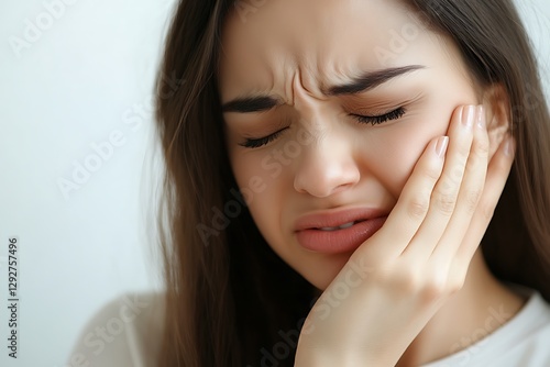 Woman experiencing intense facial pain, holding her cheek.