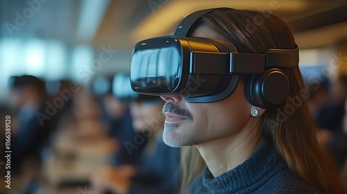 Woman experiencing virtual reality in a modern office.