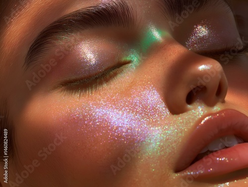 woman face, iridescent makeup, closed eyes, soft lighting, glowing skin, radiant, ethereal
