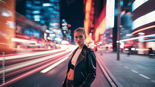 Woman Fashion Model Streetwear Modern Urban Backdrop with Vibrant Motion