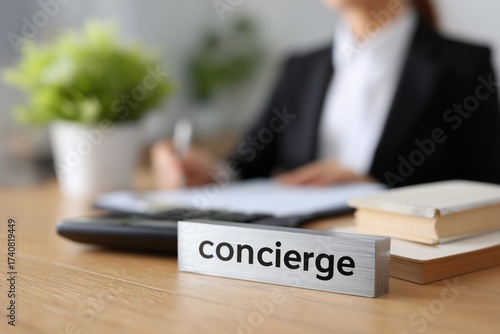Woman filling out document at desk with concierge nameplate, symbolizing hotel service and customer assistance.