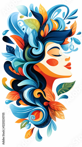 Woman, floral headdress, autumn colors, profile view, artistic illustration, design element
