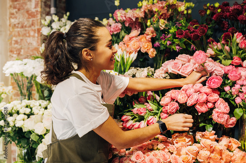 Woman florist picking flower for a bouquet in shop