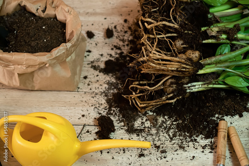 Woman gardener repotting zamiokulkas and haworthia striata flowers into new pot on wooden table, home garden concept, plant transplanting, home gardening, garden tools