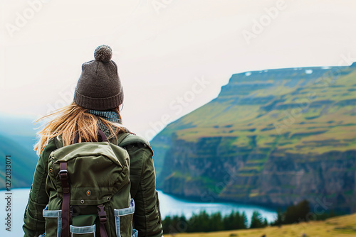 Woman gazes at stunning mountain landscape during hiking trip in early morning light on a cool day