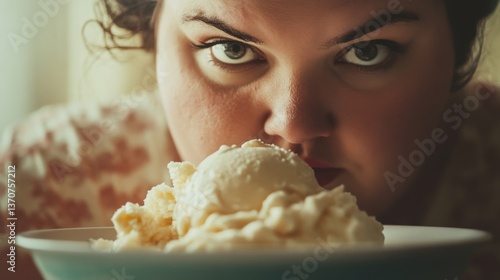 Woman Gazing Intently at a Bowl of Ice Cream with a Scoop on Top in a Bright Indoor Setting