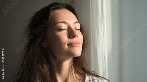 Woman gazing peacefully at sunlight through a window