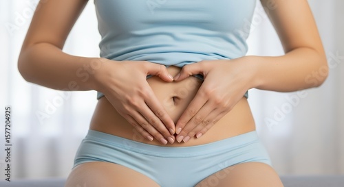 Woman Gently Holding Her Stomach in a Heart Shape, Self-Care and Body Positivity Concept