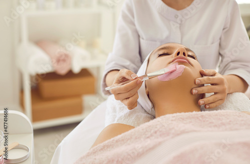 Woman getting facial treatment done by specialist in beauty salon or spa center. Beautiful lady lying on bed under soft towel and enjoying pink kaolin clay face mask for clear fresh rejuvenated skin