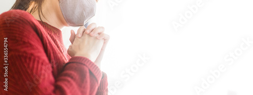 Woman girl stay at home wearing face mask for protect coronavirus covid-19.Prayer girl worship god and pray from home for coronavirus crisis.Pray at home, Church online, Praying hands, Worship at home