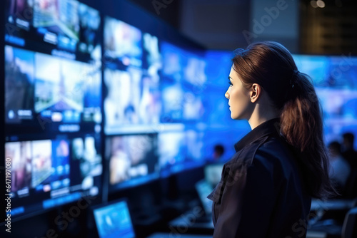 Woman Guard On Defocused Background Television Broadcasting Centers . Сoncept Tv Broadcast Security, Women In Security, Showing Authority, Defocused Backgrounds