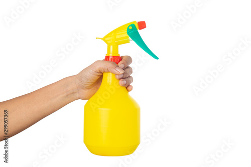 Woman hand holding a bottle sprayer water isolated on a white background