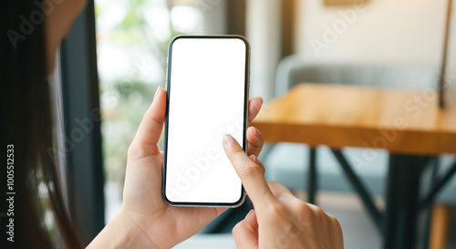 Woman hand holding a smartphone with a blank white screen on a blurred cafe background.