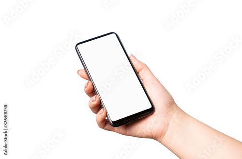 Woman hand holding and showing blank smart phone isolated on white background with clipping path around and display with copy space for your text