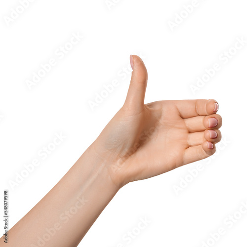 Woman hand holding something like a bottle or glass, isolated. Empty hands.