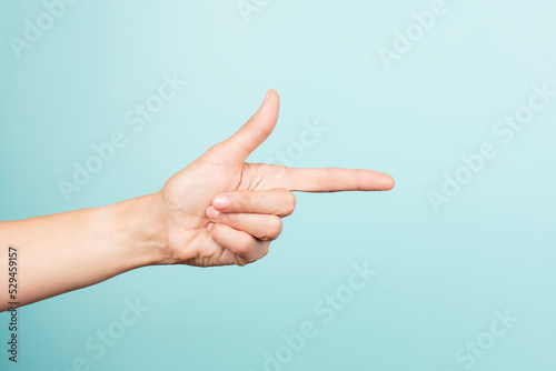 Woman hand pointing gesture. Female hand points finger at something on light blue background. Front view