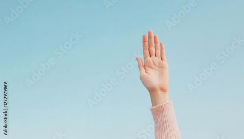 woman hand raised against clear blue sky, symbolizing hope and positivity