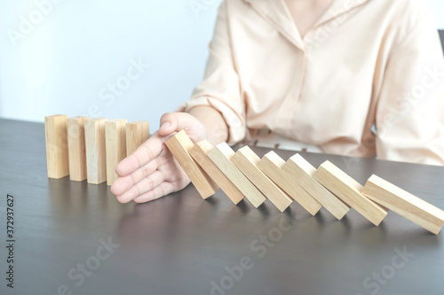 Woman hand stop wooden blocks for protect other wooden block, Concept Risk of management and strategy plan