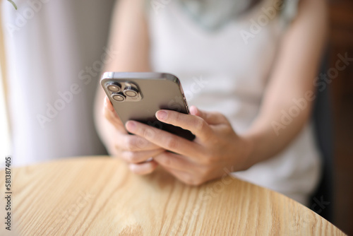 Woman hand using a smartphone for Stock exchange trading online in the coffee shop, business concept