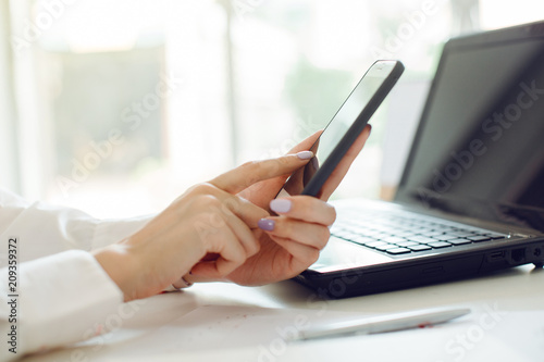 woman hand working with smart phone and laptop on desk in office in morning light