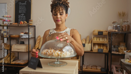 Woman handling pastries in a cozy bakery with a variety of breads and confections on display, creating an inviting atmosphere in the indoor shop setting.