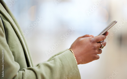 Woman, hands and phone typing for communication, social media or texting in online networking or app. Hand of female person chatting on mobile smartphone for browsing internet or research at office