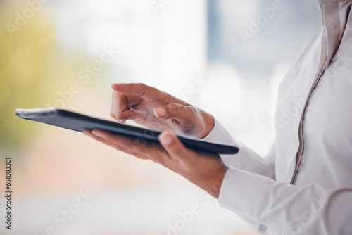 Woman, hands and tablet in research, networking or social media for online communication at office. Closeup of female person or employee with technology in browsing, web search or design at workplace